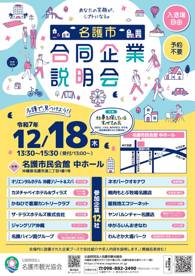 本イベントでは、名護市内の観光関連事業者が集結し、各ブースで仕事内容・必要なスキル・勤務条件・キャリアステップなどを直接聞くことができます。