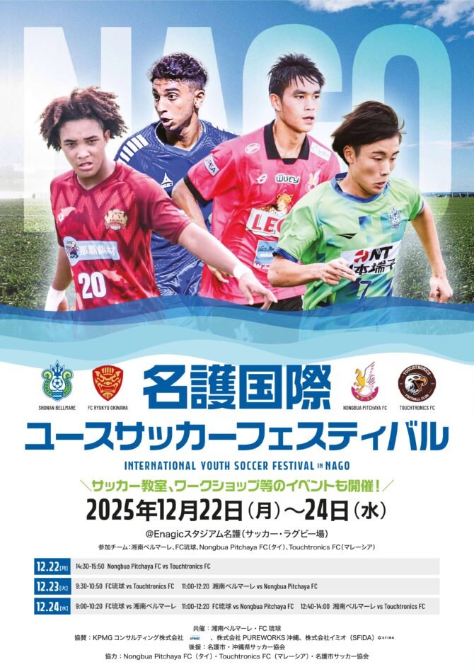 アジア圏ユース年代選手のサッカー技術の向上や交流を通じたグローバルで健全な心身の育成に貢献することを目的に、湘南ベルマーレとFC琉球の共催で「名護国際ユースサッカーフェスティバル」を12月22日(月)~24日(水)までの3日間、沖縄県名護市で開催いたします。
