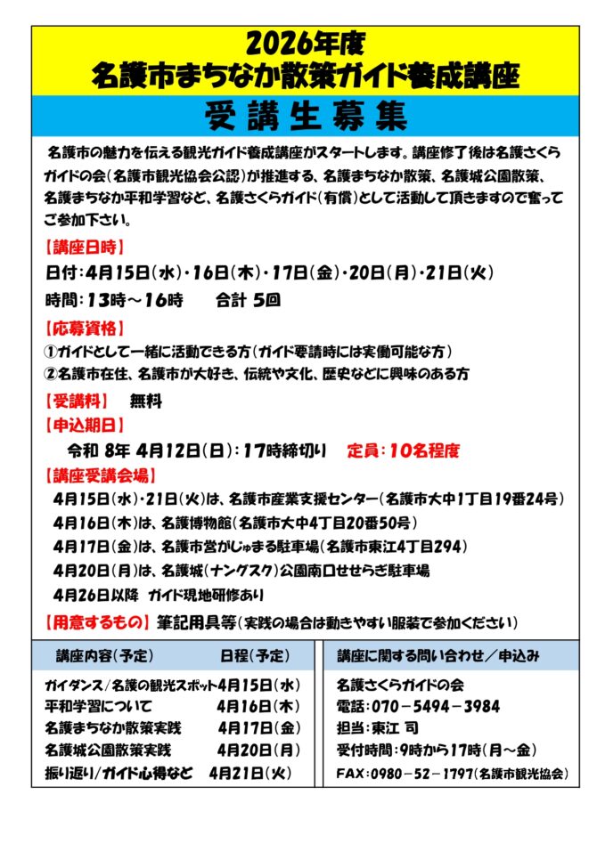 名護市の魅力を伝える観光ガイド養成講座がスタートします。講座修了後は名護さくらガイドの会(名護市観光協会公認)が推進する、名護まちなか散策、名護城公園散策、名護まちなか平和学習など、名護さくらガイド(有償)として活動して頂きますので奮ってご参加下さい。