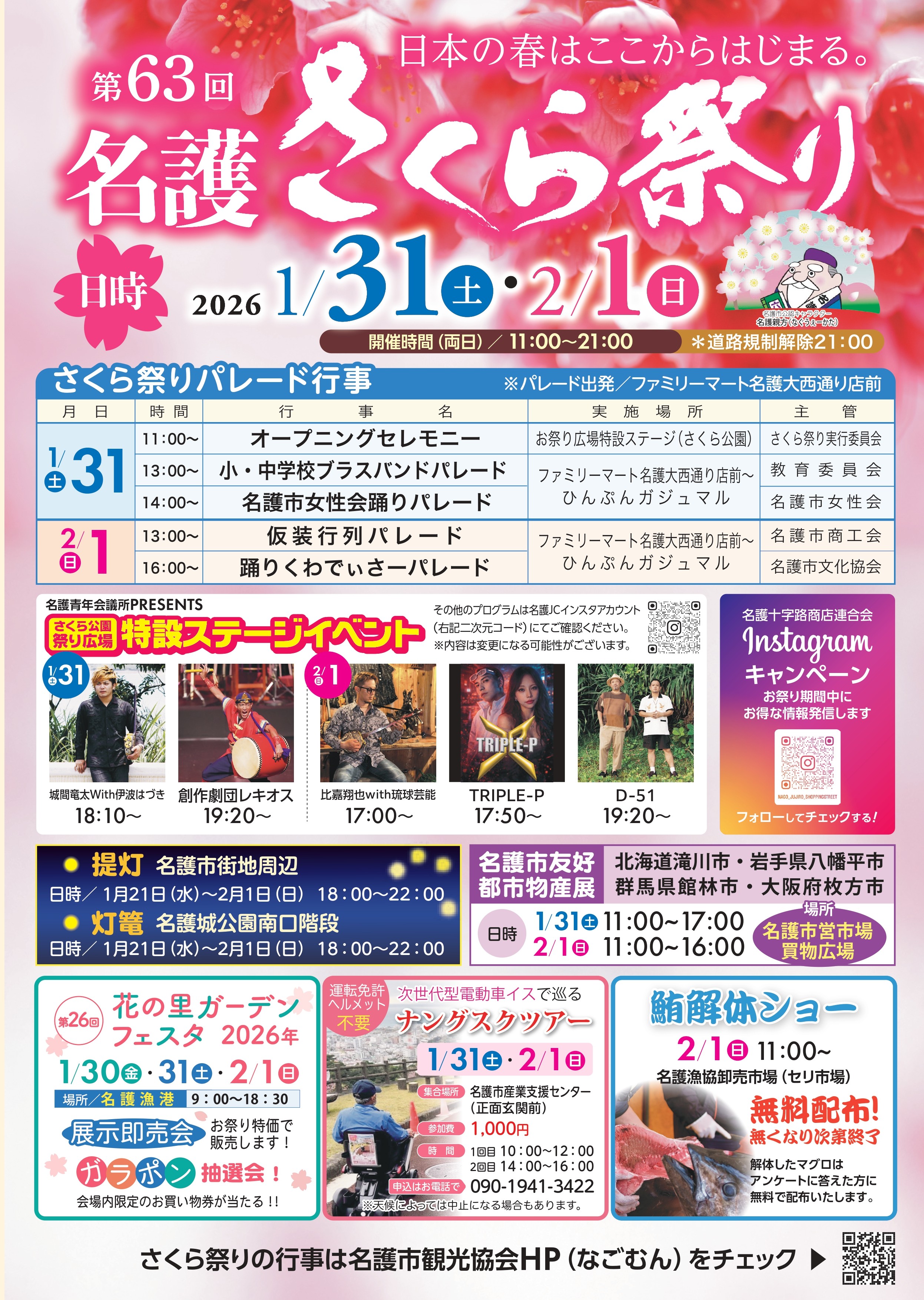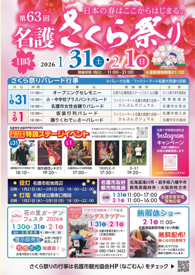 この2日間は特設ステージで様々な行事があるほか、市街地の歩行者天国では、各通り会の皆さんが中心となり、パレード、ストリートダンスや路上ライブなど名護さくら祭りを盛り上げます。ぜひこの機会に名護市内で宿泊し、名護市街地を巡って楽しみましょう。